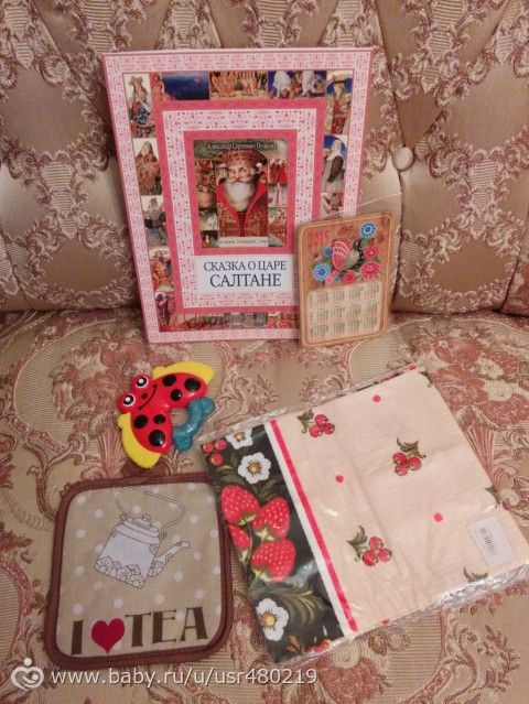 Получила посылку от Анны из Омска. Спасибо огромное тебе за посылочку! Нашей семье было очень приятно. В посылке было: книжка Пушкина А.С., полотенце, прихватка, магнит-календарь, игрушка-прорезыватель для сынульки (очень вовремя, кстати, у нас еще зубиков нет), и для меня — гели для душа и крем для рук, ну и открытка :)