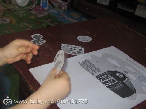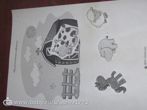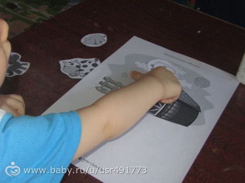 Распечатала и вырезала фигурки животных, мазали их клеем (что сыну последнее время очень нравится, даже выучил новое слово — кле (клей)) и приклеивали на листок, где ферма изображена. конечно, некоторые криво, ну ничего, главное моторика хорошо развивается))