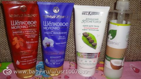 кожу увлажняю тоже по настроению либо молочком красного цвета, либо фиолетового, на живот наношу антицеллюлитный крем, пятки и локти смазываю кокосовым маслом(привезла с Тайланда)