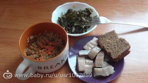 второй завтрак 11:30(гречка, помидор, хлеб, молоко)обед 14:00 (гречка с паприкой, селедка, морская капуста, хлеб)