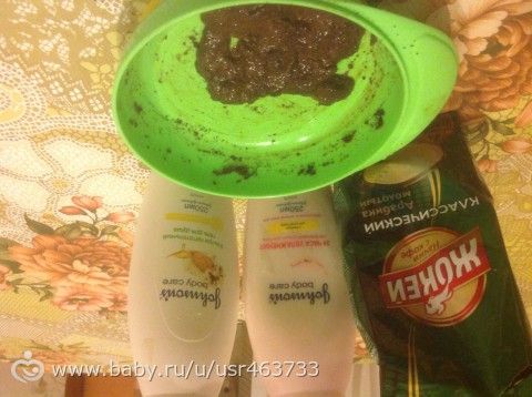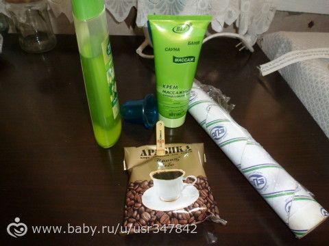 Тут все как доктор прописал! У меня все началось еще в воскресение, т.к. у меня баня со всеми вытекающими. В качестве скраба кофе+гель (мой самый любимый), на фото в баночке уже наведеный.Питание.