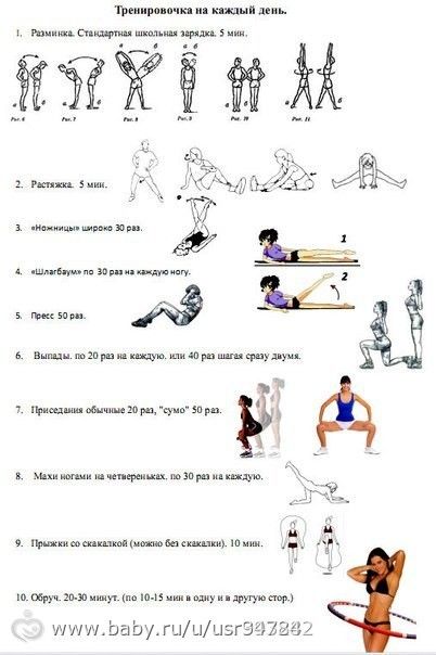 С этой недели… обруч...10 минут, приседания и пресс по системе 30 дней… если погода наладится-велосипед, а так велотренажер… ну и наклоны, скрутка… в общем общие упражнения!!!