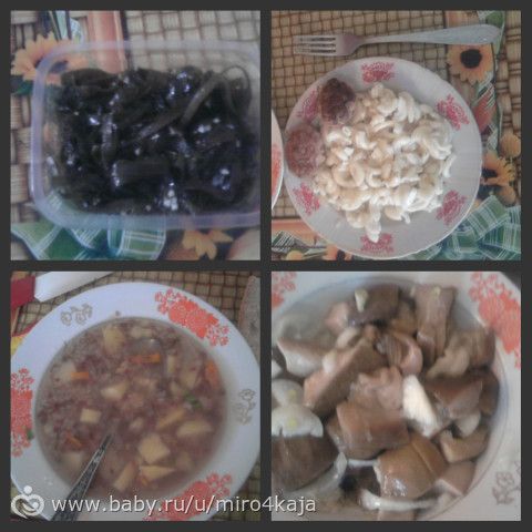 С фотками еды я облажалась)) Все откладывала на последний день и в кадр попала только вредная еда. С утра салат с морской капусты, в обед макароны с пропареными катлетами и маринованые белые грибы, ужин в 17,00 суп гречневый. И еще забыла сфоткать кефир перед сном! Я после 17,00 уже не ела, только в 21,00 выпивала 150 гр кефира.