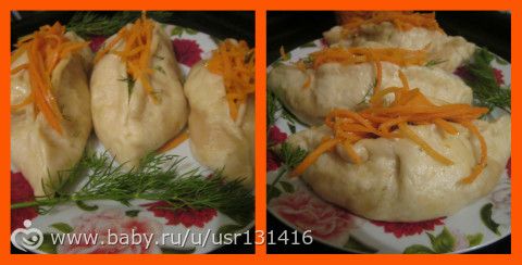 Очень вкусные пигоди. Готовим тесто: 2 стакана молока, 1 ст лож сахара, 1 чл л соли, 20 гр дрожжей, 1кг муки. Замесить тесто и поставить подниматься. В это время займемся начинкой. Взять 500гр куриного филе порезать на кусочки. 3-4 луковицы порезать мелко, 500гр капусты нашинковать слегка посолить и помять и добавить в мясо.Начинку посолить, поперчить и добавить кориандр 2 чл ., все перемешать. От готового теста отрывать шарики и приготовить пирожки которые укладывайте в мантоварку на расстоянии друг от друга, так как тесто будет подниматься. Пигоди готовятся 40минут после закипания воды в мантоварке. Готовые пигоди раскрываем по шву слепливания и закладываем салат корейской моркови и поливаем соевым соусом(кому он не по душе можно или майонез или кетчуп ). Получается очень вкусно.