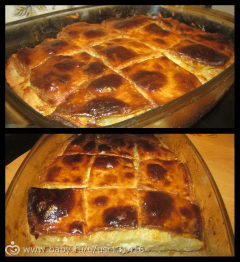 Ингредиенты: Молоко – 200 мл Дрожжи (сухие) – 1,5 ч.л. Сливочное масло (в тесто – 50 гр.; для смазывания слоёв – 120 гр.) -170 Яйцо – 1 шт. Яичный желток -1 шт. Соль -1/4 ст.л. Сахар – 0,5 ст.л. Мука -350 гр. Сыр твёрдый – 200 гр. Готовим тесто для пирога, для этого в тёплом молоке растворяем дрожжи с сахаром, добавляем яйцо, соль, размягчённое сливочное масло, муку и замешиваем тесто. Тесто ставим в тёплое место на 40-50 минут, когда тесто увеличится в 2 раза, приступаем к формированию пирога. Тесто делим на 7 равных частей. Для начинки сыр трём на мелкой или средней тёрке, сливочное масло растапливаем на медленном огне. Для приготовления пирога нам понадобится форма размером 20х25, одну часть теста раскатываем очень тонко по размеру формы и кладем в смазанную маслом форму, пласт теста смазываем растопленным сливочным маслом, равномерно посыпаем тертым сыром, далее раскатываем очень тонко следующую часть теста и кладем по верх предыдущего в форму, смазываем только растопленным сливочным маслом и так далее, посыпая сыром слои через одного, кроме последнего. Последний слой смазываем яичным желтком и затем разрезаем пирог на квадраты по всей толщине пирога, накрываем пищевой плёнкой и ставим в теплое место на 20 минут, когда пирог увеличится, выпекаем в разогретой духовке до 180 градусов 35-40 минут.
