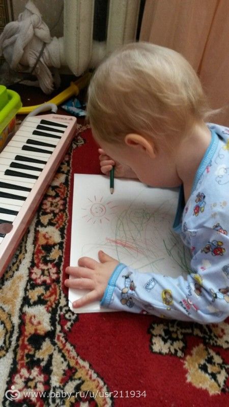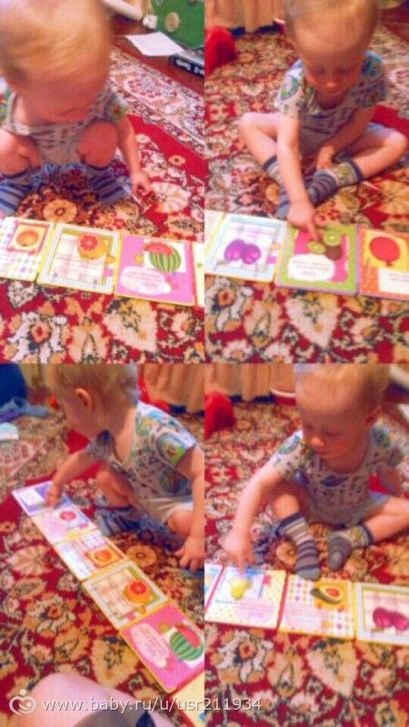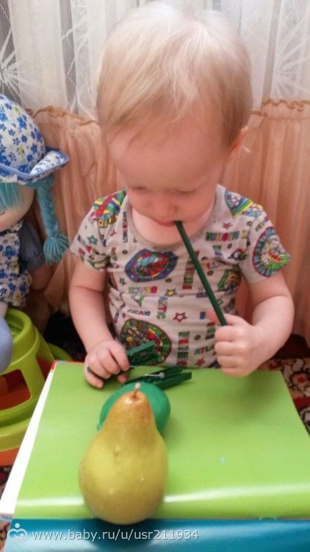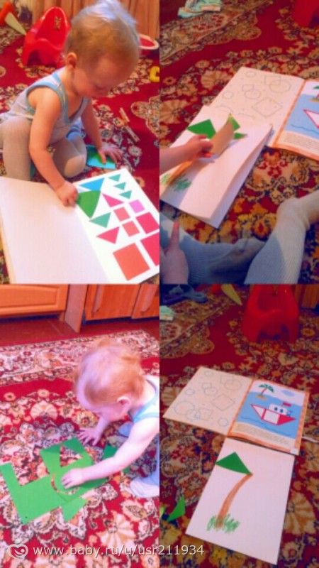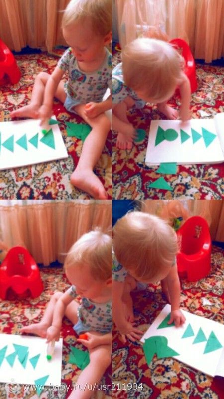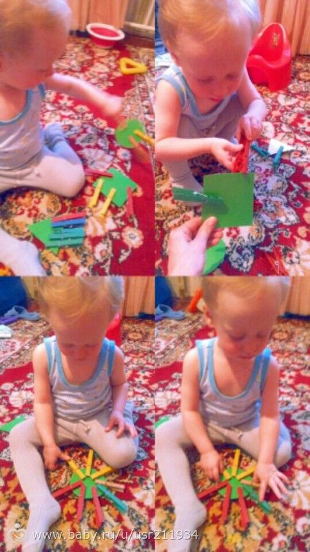 Вырезала ему из зеленого картона фигуры круг, квадрат, треугольник. Прицеляли к ним прищепки, учился цеплять.