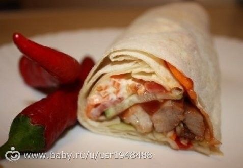 4. На лаваш выложить капусту, затем обжаренное мясо, полить кетчупом. Дальше положить помидоры и огурцы, сверху — корейскую морковку (можно приготовить самим или купить в магазине) и завершить все майонезом или сметаной.