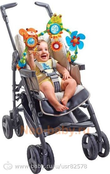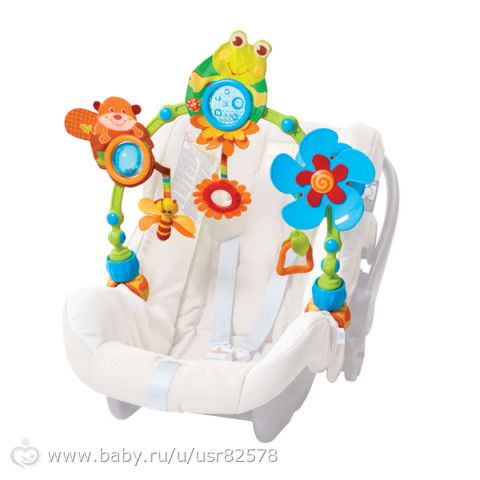 там животные шуршалки, есть колесико прозрачное с бусиками, крутить ребенку, зеркальце смотреть, синий цветок с кольцом, за кольцо дергать и цветок крутится. Нам долго служил. Думаю что это вещь незаменима. Сначала малыш разглядывает,. потом низко висящие игрушки пытается потрогать, потом хватает, крутит, шуршит, потом когда подрастет начнет колечко дергать, надо силушку приложить. Развивашка отличная. Стоили от 1300 до 2000. но есть разные, не обязательно прям такую. Смотрите на функционал, что можно с ней делать. Эта удачная, ребенок шуршащих зверюх любил и за колечко дергать цветок.