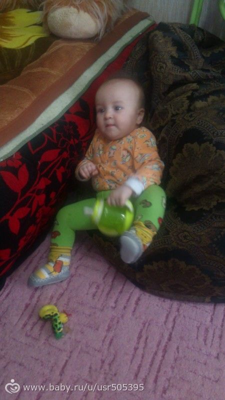 Вчера нам было 10 месяцев, ездили в больницу-приехали а там нет народа вообще(вот это нам повезло как говорится). Весим 9500 кг, рост 72 см. Проблема в том, что у нас низкий гемоглобин так и остался(был 109, за месяц подняли до 112). Пьем капли содержащие железо. Сказали пить еще месяц, а потом опять сдавать кровь.А в остальном все нормально-ходим только очень медленно и это ей не нравится, она опускается и ползет, так ей быстрее, учимся собирать пирамидку, разбирать то мы ее уже умеем и давно, любим все крушить, грызть все бумажное(обгрызла практически все свои музыкальные книжки). Смеемся по любому поводу, особенно ее забавляет собачка наша. А и еще обожает корчить всякие моськи и смотреться на себя в зеркале. Ну и не много фоток.