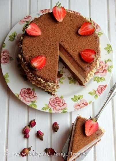 4. Готовый сметанник вытащить из формы. Можно покрыть верх и бока глазурью. У меня оставалось немного растопленного шоколада, я смешала его со сливками и кусочком масла. Слой получился очень тоненьким. Бока украсила крошкой из печенья, а верх посыпала какао-порошком. Украсила клубникой.