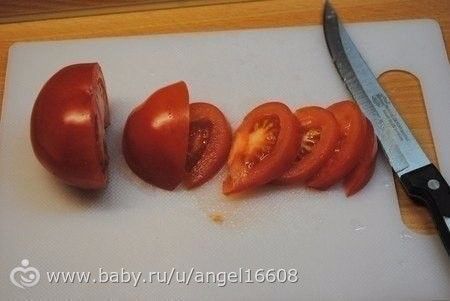 2. Режем помидор полукольцами (можно любым другом способом, но лучше крупно).
