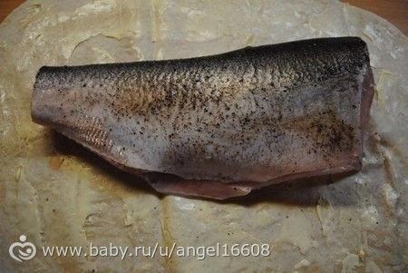 4. В середину одного листа выкладываем нашу рыбу. Солим, перчим, добавляем специи – по вкусу. Лично я для этого рецепта только солю.