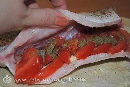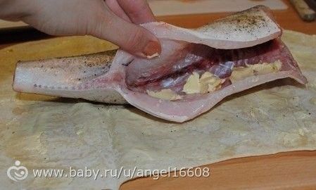 5. Во внутрь брюшка кладем кусочки сливочного масла. Он придаст рыбке немного сочности.