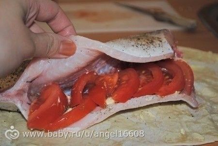 6. Также во внутрь брюшка кладем дольки помидора и укроп. Лучше использовать свежий укроп (его можно положить прямо пучком или мелко порезать). Если Вы используете свежий укроп – то кладите его больше – вкус только улучшится. В принципе можно добавить и петрушку для аромата.