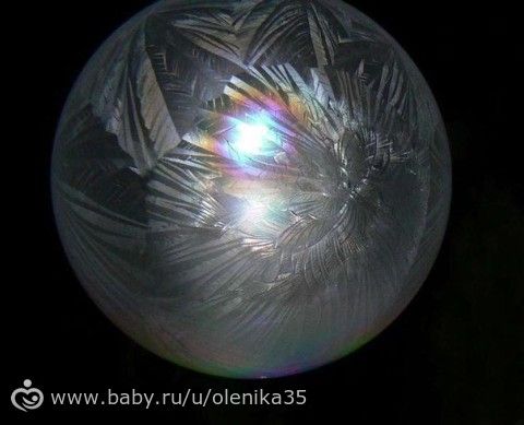 Снежинка соприкоснется с пузырем и от места соприкосновения во все стороны побегут кристаллики льда. Причем тип кристаллизации будет такой же, как и у снежинки. Таким образом можно заранее выбрать нужный рисунок. предварительно рассмотрев как следует снежинку. А ещё можно заморозить пузырь, если аккуратно выдуть его на рыхлый свежевыпавший снег.