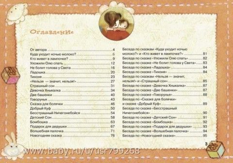 Вот для этих случаев и нужна эта книга! В ней 19 сказок о девочке Оле. Все сказки написала ее мама. Все сюжеты не придуманы, а взяты из жизни. И все они — один в один ситуации, которые часто заканчиваются капризами, слезами, ссорами родителей и детей (например, малыш не хочет спать в своей кроватке, боится идти к доктору или темноты, отказывается пить лекарство и т. п.).