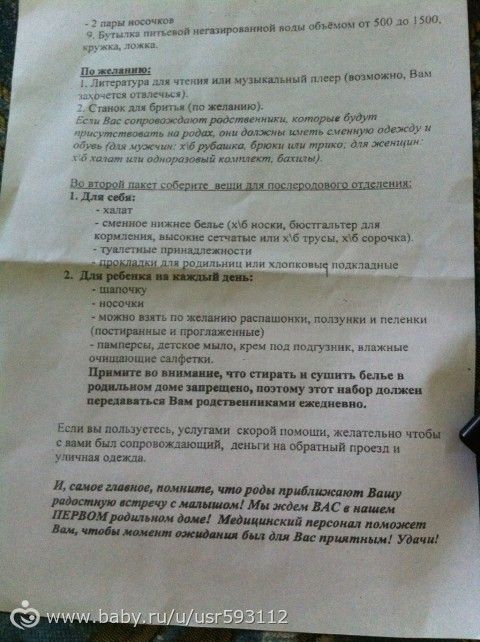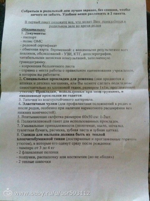 А перед родами — 2 подгузника, 2 теплых пеленки, чепчик, носочки ребенку, себе обязательно возьмите что-нибудь вкусное)) я просто мечтала о сникерсе, пока ходила в схватках 10 часов, в это время можно перекусить, потому что потом долго кормить не будут.