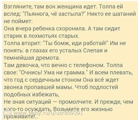 Это точно, сейчас просто люди такие, чтобы не помогать-легче сказать, что алкаш, наркоман и все такое… а подойти и поинтересоваться в чем дело-это такой огромный труд… что не каждому по силам оказывается.