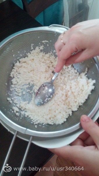 Постепенно порциями подсыпала и нажимала на ложку, как бы втирая творог в стенки дуршлага. Вспомнила, как давным-давно так смородину красную 2 часа протирала. А потом за 5 минут все съела. Эх, были времена, когда варенье банками лопала. Так в мыслях о прошлом и провела протирание творога. Получилось вот что...