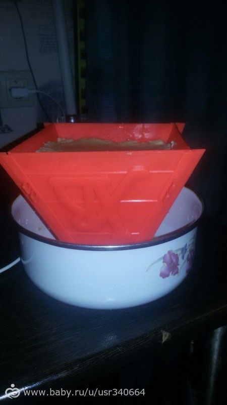 Получившуюся творожно-сливочную массу варила, а вернее, томила на маленьком огонёчке 3 часа. После чего откинула на дуршлаг, дала лишней жидкости стечь и утрамбовала в формочку, так называемую пасочницу. Которую нужно перевернуть и обязательно поставить в какую-нибудь ёмкость, потому что жидкость с творога будет стекать.