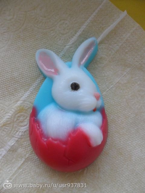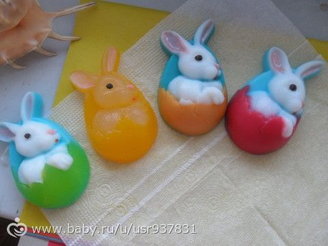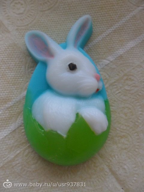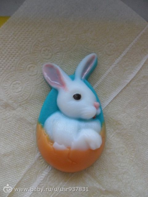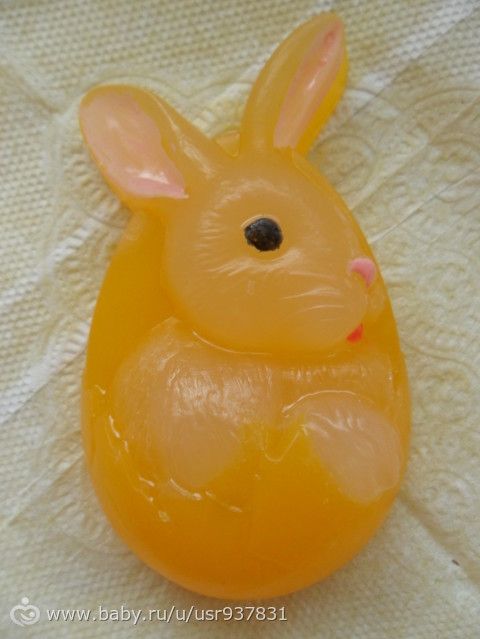 а следующий зайка, желтенький, он из органической основы на глицерине, без красителей и отдушек, можно для детишек от 0 мес. делала на заказ маленькой девочке. в этого зайчика добавила только масло облепиховое, и цвет поэтому такой и несколько капель эфирного масла апельсина.
