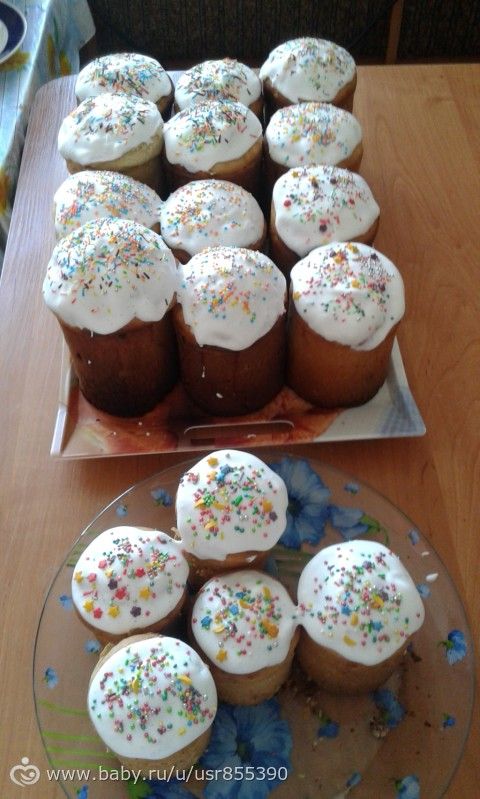 Рецепт: 1 л. молока, 2 ч. ложки дрожжей сухих, 20 желтков+3 яйца, 850 гр масла, 900 гр сахара, муки как на очень густые оладьи, 200 гр изюма. За 4 дня настоять на стакане коньяка цедру 1 лимона и апельсина. Жидкость потом через сито вылить в тесто. Рецепт старинный, бабушкин