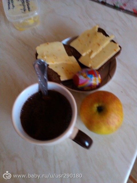 завтрак 2 куска бородинского с острым сыром, яйцо, яблоко(напополам с сынулей), кофе черный б\с