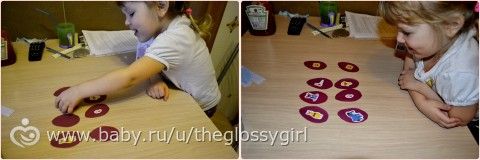 ну и правила как в обычном мэмори — все перевернуто лицом вниз, поднимаешь картинку одну, потом вторую, если они разные — переворачиваешь назад, но запоминаешь уже где какие и когда переворачиваешь 3, 4,5 то легче найти пару «по памяти» — доча справлялась хорошо, приходилось все усложнять и усложнять)