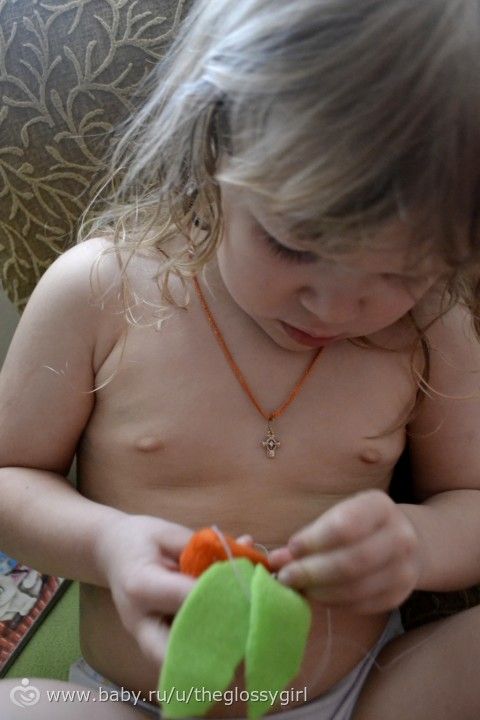 а еще в субботу мы решили нашему зайке сшить морковку, и дочка изъявила желание тоже научится шить) будем учится вместе)