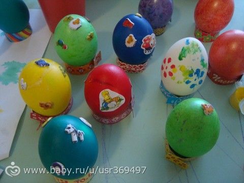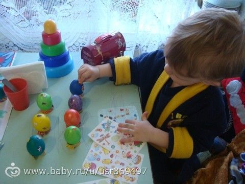 Поговорили про праздник. Поставила перед малышом яйца. Показала как можно на них клеить наклейки (спец.для яиц) Ему больше понравились маленькие объемные с животными.