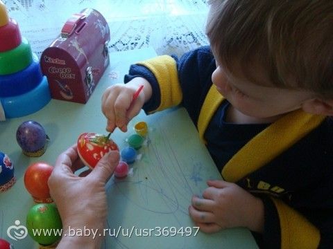 Далее через трафарет показала как можно разукрасить яйцо. Ему понравилось!)) (трафарет с красками и с кистью в наборе заранее купила в фикс-прайсе)