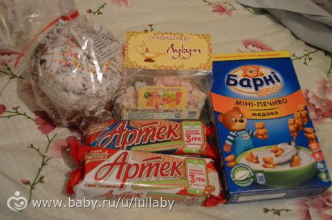 первое, что бросилось в глаза — сладости и куличик