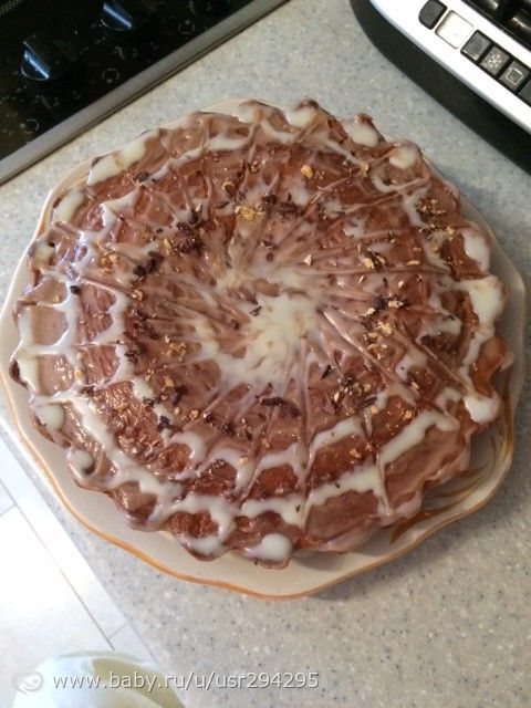 Сверху смазала кремом, налила по спирали сгущенки и ножом сделала паутинку. Повторюсь — на скорую руку, малыш уже проснулся, поэтому не получилось постараться с паутинкой:)))