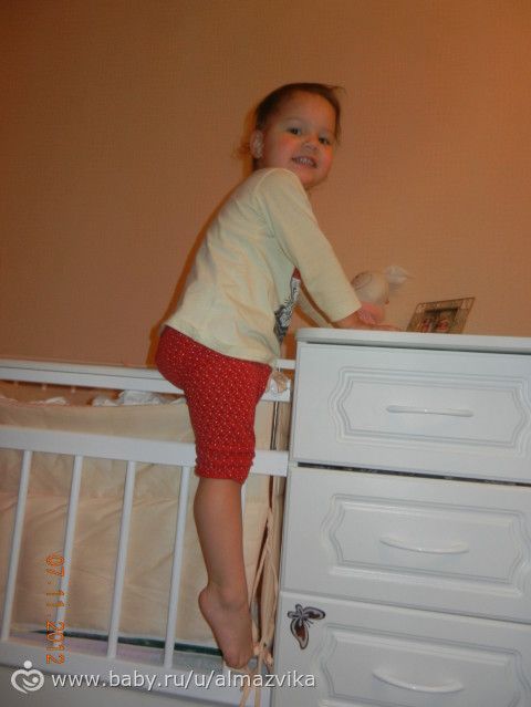 Девочки подскажите сломала уже голову. У меня дочери 1 год рост 80см весим 10,5 кг. Сегодня утром она вылезла сама иЗ кровати и пришла к нам на кровать. Просто не плакала ни чего. Я смотрю на ее кровать и не понимаю как она это сдела Сегодня мы опустили ей матрас на самый низ и убрали прутья на всякий случай, но вопрос остается как это?