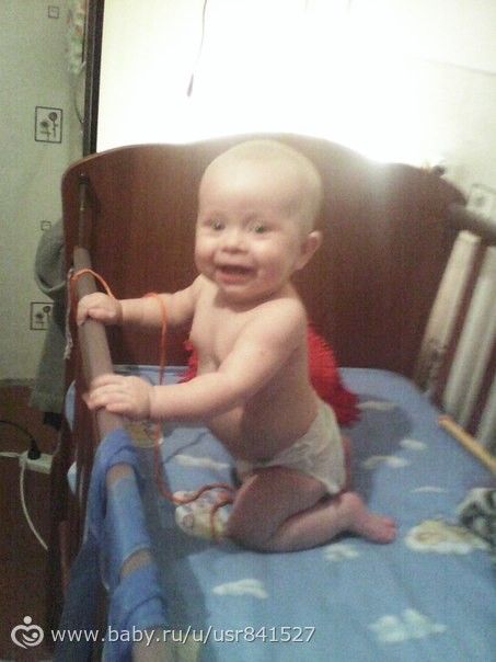 улыбака такой) а мы уже перегородку подняли на кроватке, наша тоже так научилась держаться за кроватку и садиться.