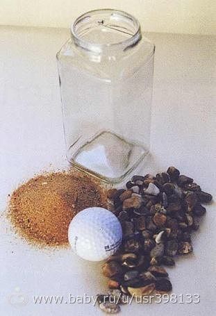 Когда в вашей жизни слишком много всего, когда 24-х часов в сутках не хватает — вспомните о банке из-под майонеза… и кофе. Профессор философии стоял перед слушателями, а на столе перед ним лежало несколько предметов. Когда лекция началась, он, не говоря ни слова, взял очень большую и пустую банку из-под майонеза и начал заполнять её мячиками для гольфа. Затем он спросил студентов, заполнена ли банка? Они ответили «да». Затем профессор взял коробку с галькой и высыпал её в банку. Он немножко потряс банку. Галька забила пространство между мячиками. Он снова спросил студентов, была ли банка полной. Они подтвердили, что это так. Затем профессор взял коробку с песком и высыпал его в банку. Конечно же, песок заполнил все пустоты. И он снова спросил студентов, была ли банка полной. Студенты ответили «да». Профессор взял две чашки кофе, которые стояли под столом и вылил их в банку, заполнив всё свободное место между песком. Студенты рассмеялись. «Итак!» сказал профессор, когда все успокоились, «Я хочу, чтобы вы представили, что эта банка — ваша жизнь. Мячики для гольфа — это важные вещи. Это ваша семья, дети, вера, здоровье, друзья и ваши любимые увлечения. Даже если все остальное потеряно, но остались эти вещи — ваша жизнь всё равно будет полной. Галька представляет собой остальные вещи, которые имеют значение. Ваша работа, дом, машина. Песок — это всё остальное. Это мелочи. „Если вы сперва заполните всю банку песком, — продолжил он, — в ней не останется места для гальки и мячиков для гольфа. То же самое происходит и в жизни. Если вы потратите всё свое время и энергию на мелочи, у вас никогда не будет места для вещей, которые действительно важны для вас. Обратите внимание на те вещи, которые важны для вашего счастья! Играйте со своими детьми. Заботьтесь о своём здоровье. Пригласите спутника жизни в ресторан. Станьте снова 18-летним. У вас всегда будет время на уборку дома. Позаботьтесь сразу о мячиках для гольфа, о том, что действительно важно. Выставите приоритеты. Остальное — это песок“. Один из студентов поднял руку и спросил профессора, а что же означает кофе? Профессор улыбнулся. „Я рад, что вы задали этот вопрос. Оно просто показывает, что неважно насколько полна ваша жизнь, в ней всегда есть место, чтобы выпить пару чашек кофе с другом“