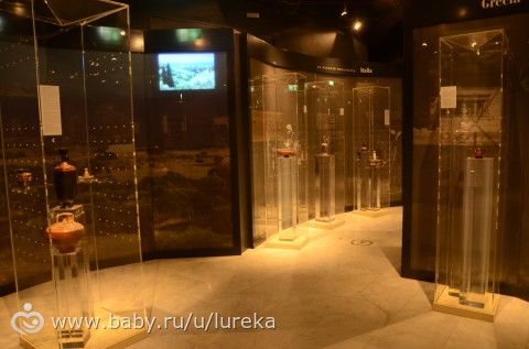 Показаны были разные страны, где оливки возделываются.Представлены монетками, амфорами, кувшинами и немного истории в фотографтях.Ещё небольшие телевизоры в залах, где или показываются фотографии или короткометражные фильмф по теме идут.