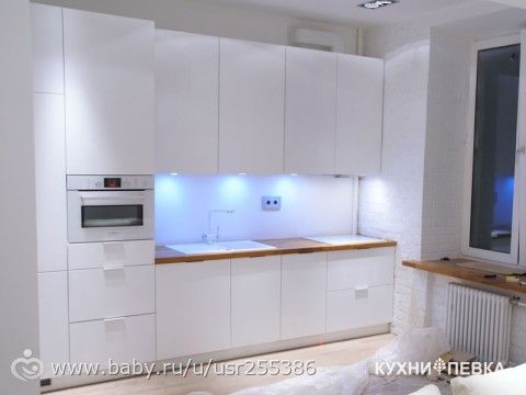 Вся бытовая техника белого цвета, в том числе и варочная поверхность и духовой шкаф. Кухня сама по себе темная — северная сторона+лоджия. Кухня не большая — 9квм.