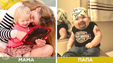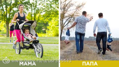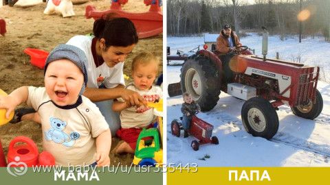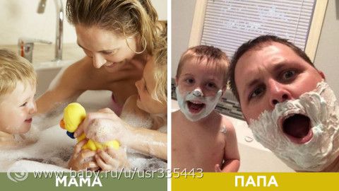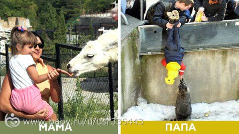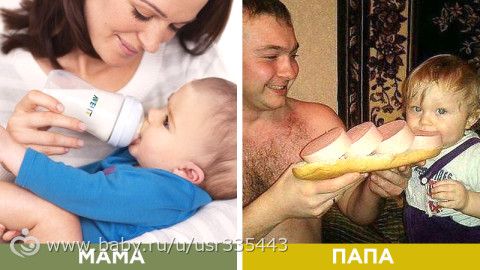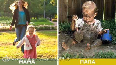 УЛЫБНУЛО :))) Статья в издании Ofigenno.cc "То, что процесс воспитания детей отцами и матерями разительно отличается, понятно и ежу. Там, где мамы видят смертельную опасность, папы находят отличную возможность подурачиться и проявить свои таланты. То, от чего мамы тщательно уберегают своих отпрысков, находчивые отцы рассматривают как превосходный материал для игр, забав и развлечений. Ofigenno.ccподготовил «говорящую» подборку о том, чем же отличаются основные принципы воспитания ребенка мамами и папами. Не воспринимайте всё всерьез, это всего лишь порция позитива, призванная улучшить настроение. Однако, как говорится, в каждой шутке есть доля… :)
