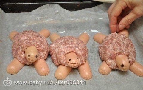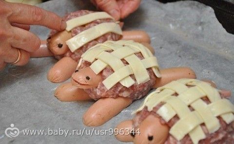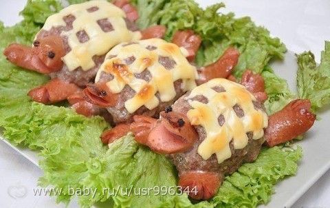300-400 г мясного котлетного фарша 5 детских сосисок, сыр бутербродный в пластинках, соль, перец, несколько штук гвоздики или горошин черного перца для украшения, листья салата для подачи. Сосиску разрезаем вдоль на две половинки, затем поперек. С одной стороны делаем ножом два надреза. Получается четыре «лапки». То же проделываем еще с двумя сосисками. Оставшиеся сосиски разрезаем на три части: концы сосисок – это «головки» двух черепашек, а середина – «хвостики». На каждой «головке» делаем горизонтальный надрез – это будущий «ротик». Фарш солим и перчим, формируем котлеты. Втыкаем в них «лапки», «хвостик», «головку», из гвоздики или горошин перца делаем глазки. Переходим к панцирю. Пластинки сыра нарезаем полосками и в виде сеточки выкладываем на котлету – «спинку» черепашек. Ставим наши котлеты в духовку 180° С на 30-35 минут. Как только сыр начнет запекаться, накрываем котлеты фольгой. Минут за 5 до конца запекания фольгу снимаем, чтобы дать сыру подрумяниться. Горячие котлетки выкладываем на зелень и сразу подаем к столу. Приятного аппетита!