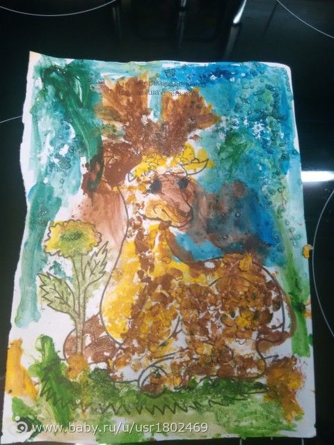 Сначала доча намазала клеем, потом посыпала хлопья, потом соль, потом разукрасили. Все делали вместе!.