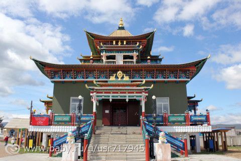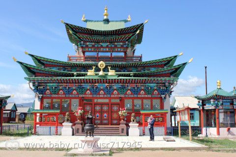 Ездили всей семьей в этот дацан, пользуясь нынешним местоположением. Ехать недалеко, минут 40. Колорит, конечно, впечатляет — все такое яркое и необычное (крыши, рисунки на фасадах). Это считается святым местом и приезжают сюда с разных концов России и не только (китайцев и монголов тоже хватает). Мы ходили сами и бесплатно, не считая билета за просмотр нетленного тела, а вообще там есть экскурсии. Но мы и так разобрались что к чему. На территории дацана есть несколько ихних монастырей и обычные деревенские домики, где монахи видимо живут, а может и просто днем отдыхают. Так же они ведут прием в качестве астрологов. Мы не рискнули зайти, а на работе у мужа говорят, что они как ясновидящие все рассказывают о тебе. Самое интересное, что здесь находится нетленное тело Пандита Хамбо Лама Итигэлова, который просидел в земле в позе лотоса около 75 лет и тело его имеет прижизненные характеристики, то есть не разлагается и не имеет трупного запаха. Фоткать его нельзя, но с инета никто не отменял. Ну а теперь, собственно, и немного фоток.