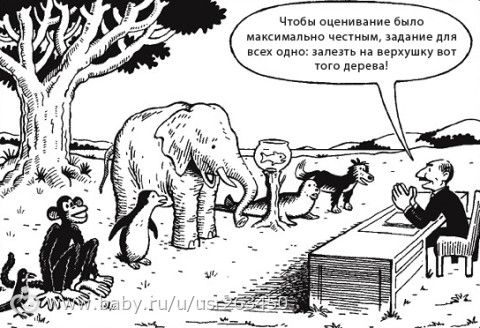 И еще, пришла на ум, гуляющая в инете картинка и цитата Эйнштейна: Все мы гениальны, но если вы будете судить о рыбе по ее способности взбираться на дерево, она проживет всю жизнь считая себя дурой.