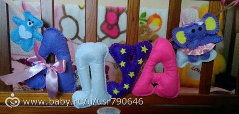и 2 именные гирлянды делала впервые! машинки не было пришлось вручную шить.Одну сделала доченьке моей подруги, еще хочу в скором будущем буквы-подушки сшить и лоскутное одеялко.У нас в городе нет красивых тканей(