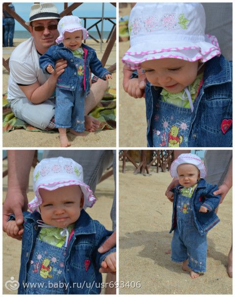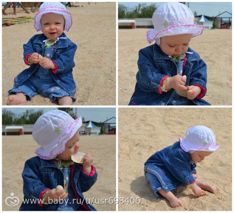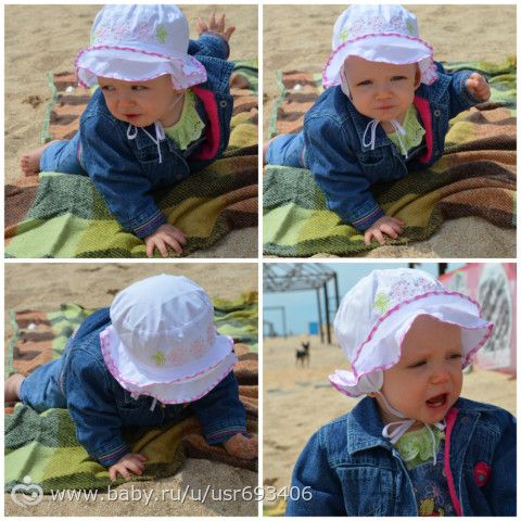 Юля первый раз на пляже. Море её особо не впечатлило, а вот песок вызвал целую бурю эмоций. Сначала он ей жутко не понравился, она ни в какую не хотела покидать покрывало, сердилась что он липнет к ручкам, даже решила немного всплакнуть от возмущения.