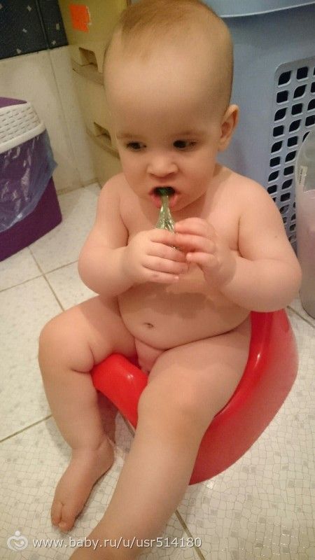 У Сани два зуба, которые вылезли 20 апреля и 1 мая. Мы их чистим настоящей зубной щёткой во время утреннего сидения на горшке (с утра ходим по-большому).