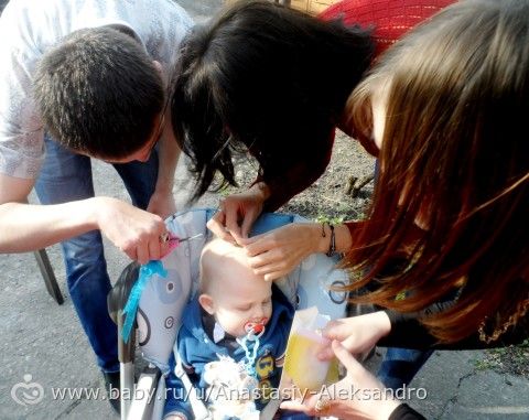 Гадали на будущее, всем было очень интересно, Славик долго рассматривал, перебирал, в итоге взял кольцо — большую любовь. =) Также собирали подарочек на 18-летие, в коробочку сложили первый одетый человечек и шапочку, соску, бирочку с роддома, конверт со срезанными волосами и письменные поздравления каждого из гостей.