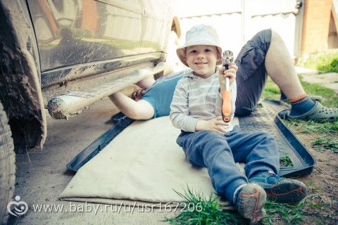 сегодня наш папа валялся под машиной, а Даня ему «помогал» :) а когда «допомогался» стал чинить свой драндулет :) а Стёпа серьёзный наблюдатель :)