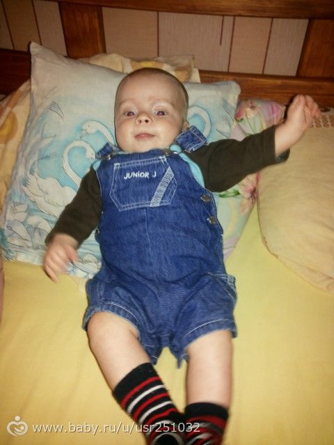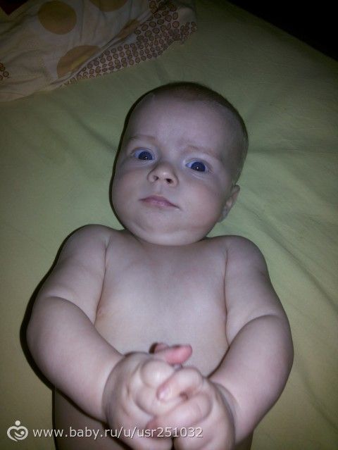 Уже 4 месяца а вроде бы недавно беременной ходила))) Малышык наш растет характерный… чуть что не получается сердиться, рычит, пищитНо и улыбается часто, особенно любит когда мама показывает ежикааж заливается, боится щекотки в том месте где и папаПытаемся сидеть, положу его на свою подушку. укрою одеялом, а он за него хвать и садитсяА вот с поворотами у нас беда с живота на спину крутимся, а со спины только по сторонам… Ползать хотим, но пока еще на понимаем что нужно попку поднять, что бы поползти Очень болтливые особенно в 5.00 утрапросыпаемся и начинаем извергаться, любимое «слово» «алелеу»)))) и что оно значит… Уже пробовали яблочко, и бананчик. По отдельности фи, а вместе лупит аж бегомИз печального: срыгивания наши так и не прекращаются, пойдем во вторник к доктору попрошу направление, чтобы желудочно-кишечный тракт проверить. Начали резаться зубы, из-за этого и спим плохо и капризные стали. Слюни рекой, все в рот тянет. Вес и рост пока не знаем, но приблизительно 6200-6300 г и рост 62-63 см Вот такие мы))) Всем желаем здоровья