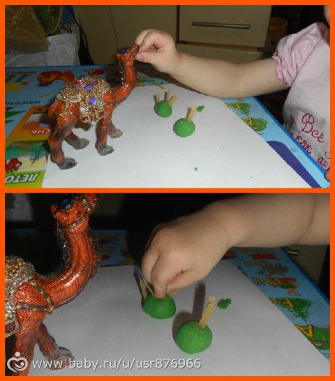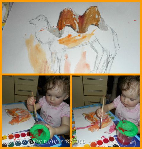 рисовали верблюда, горбы я сделала из штучек для яиц, очень наглядно получилось. Иногда Скрипка отвлекалась на декор непроливайки.